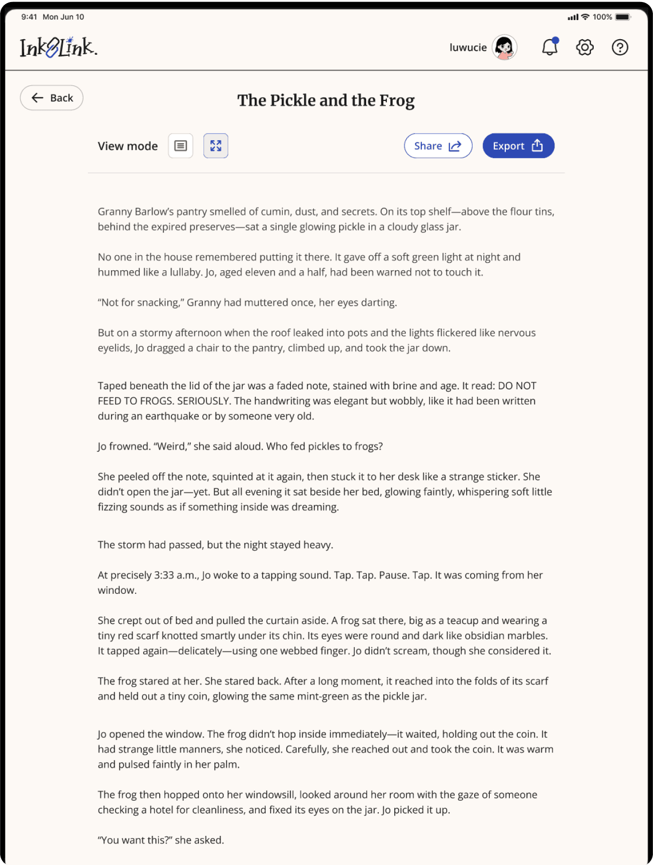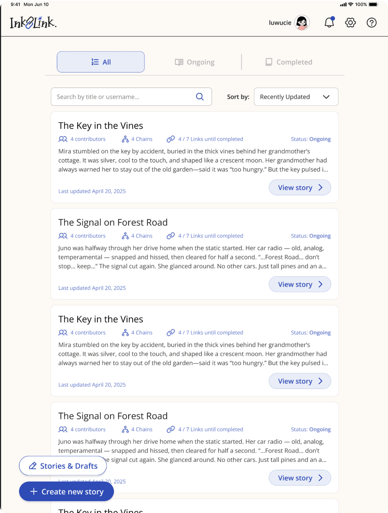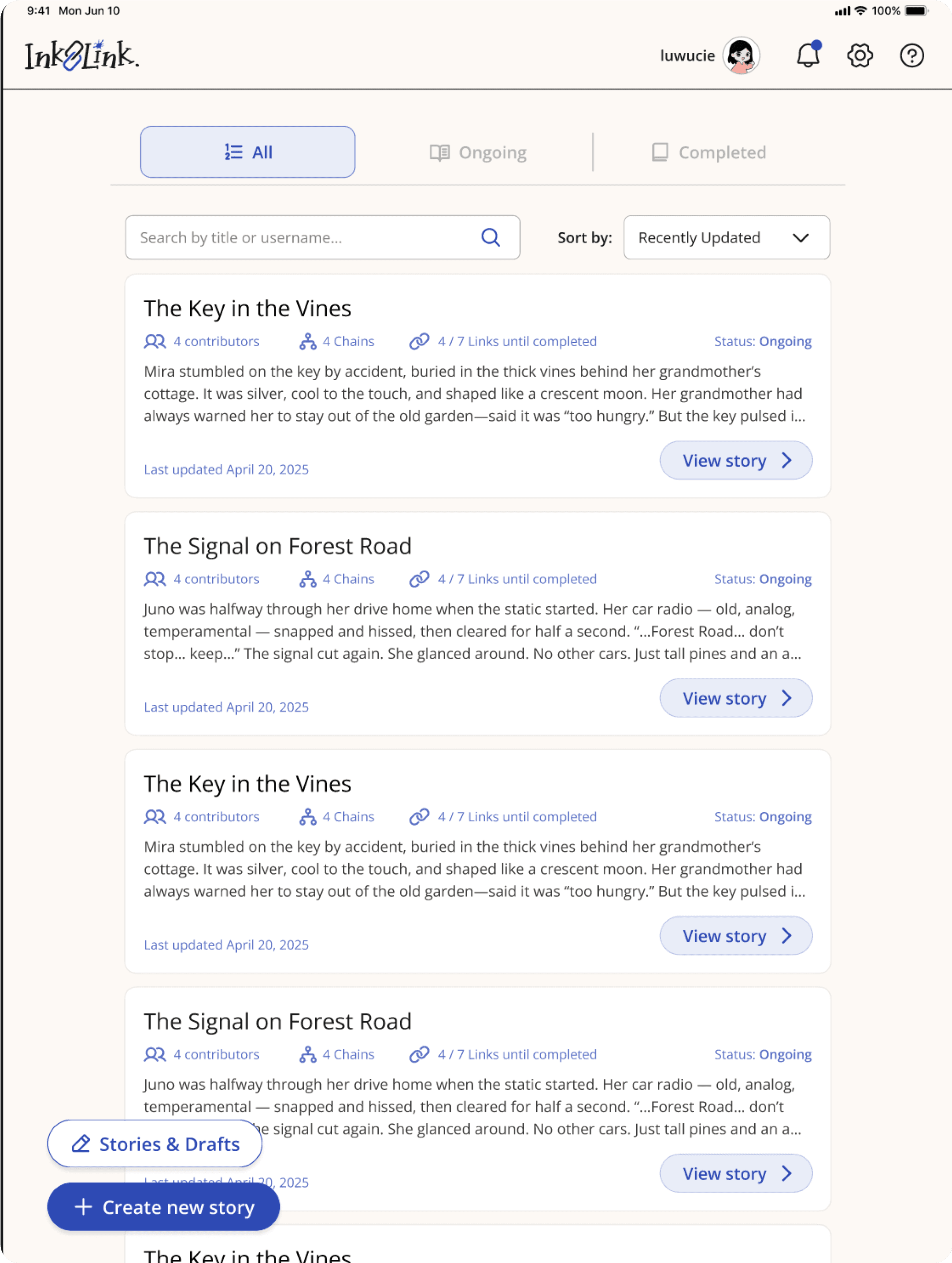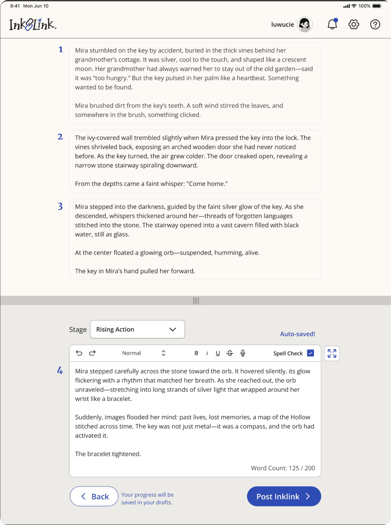 Celebrate your creativity! Publish your chains, receive feedback, and build a following. With InkLink, your words can inspire and connect with writers everywhere.